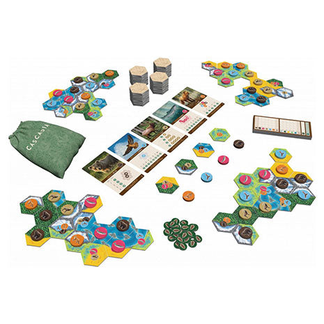Cascadia es un juego de estrategia para 1 a 4 jugadores en el que tendremos que ganar puntos creando un hábitat natural con las fichas y tokens de juego. Cada jugador dispone de una loseta inicial puesta en juego al principio de la partida en su zona de juego. En el centro de la mesa dispondremos los objetivos públicos que utilizaremos para conseguir puntos en esa partida, así como un mercado inicial formado por parejas de losetas hexagonales y fichas de juego. Cada ronda en nuestro turno elegiremos parejas y colocaremos la loseta y la ficha en nuestra zona de juego. Las losetas de juego nos permitirán crear paisajes para ubicar las fichas de juego, que representan los animales que los habitan, si están representados en ellas. Al colocar la ficha de juego, por tanto, deberemos hacerlo sobre cualquier loseta ya colocada que tenga ese icono representado. Las losetas podremos ponerlas donde queramos, pero será mejor hacerlo en áreas cuanto mayor sea posible, ya que al final de la partida ganaremos puntos por la máxima extensión de cada uno de los paisajes en nuestra zona de juego, pero sin perder de vista los iconos representados para conseguir los objetivos de la partida. Cascadia es un juego de estrategia abstracto de normas sencillas pero lleno de decisiones. Basado en una dinámica de draft, propone elegir parejas indisolubles por lo que las decisiones se complican especialmente a medida que vamos avanzando en la partida. A demás los objetivos elegidos aleatóriamente nos obligarán a decidir qué manera utilizamos para conseguir puntos esa partida. Y por sus características es un juego que funciona de manera excelente con 2 jugadores. Quiero saber más.