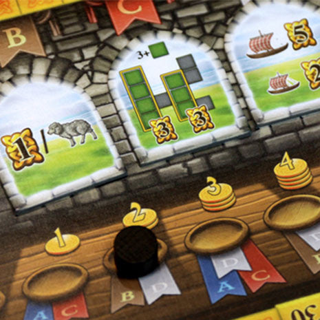Un jugador en su turno debe robar de la bolsa tres losetas y colocarlas delante de su pantalla; secretamente detrás de su pantalla el jugador debe descartar una y asignar coste a las dos restantes. Los jugadores remueven sus pantallas y revelan la información, la loseta a la cual se le ha asignado el hacha vuelve a la bolsa y se procede a la fase de compra. El jugador activo puede pasar o comprar una loseta de otro jugador pagando el coste en monedas que ha asignado su propietario, el vendedor recibe las ganancias y también recupera las monedas usadas para definir el precio de venta. Las losetas no vendidas son ahora propiedad de cada jugador y pierden el dinero que se había usado para asignar su precio. Los jugadores proceden a colocar las losetas en su área individual de juego, se deben colocar de manera que los territorios coincidan. Es un juego extremadamente sencillo de reglas y que ofrece decisiones interesantes, durante un turno si fijamos el precio de una loseta muy bajo correremos el riesgo de que cualquier oponente se la lleve, pero si fijamos el precio muy alto nos arriesgamos a no tener suficiente dinero para comprar lo que nos interesa. Ofrece una sorprendente rejugabilidad, en cada partida se usan sólo cuatro losetas de puntuación de las 16 disponibles en el juego, por lo que tendremos variedad de partidas y horas de juego garantizadas.