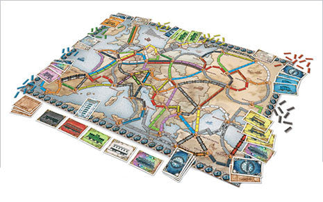 Ticket to Ride (aka. Aventureros al Tren) es un juego de estrategia para 2 a 5 en el que tendremos que crear líneas de ferrocarril a lo largo de los Estados Unidos. El objetivo del juego es ser el jugador con más puntos de victoria al final de la partida. Y para ello deberemos conectar las diferentes ciudades del mapa con lineas de tren. Cada jugador dispone de vagones de tren de su color y, cada turno podrá robar cartas, jugar cartas o coger una nueva carta de ticket. Podremos robar cartas boca arriba o, si ninguna nos interesa, boca abajo del mazo de robo. Cuando tengamos suficientes cartas para reclamar un tramo de vía disponible, podremos jugarlas para colocar nuestros vagones sobre ese tramo: así ganaremos puntos de victoria y evitaremos que los demás jugadores ocupen esa vía. La partida termina cuando un jugador coloca el último de sus vagones en el tablero. Ganaremos puntos de victoria adicionales por cada ticket que hayamos sido capaces de completar... ¡y restaremos por los que hayamos dejado a medias! Ticket to Ride es un juego de estrategia familiar, que combina el draft de cartas, la ocupación de tablero y una dinámica de set collector con normas sencillas y accesible para todos los públicos. Quiero saber más.