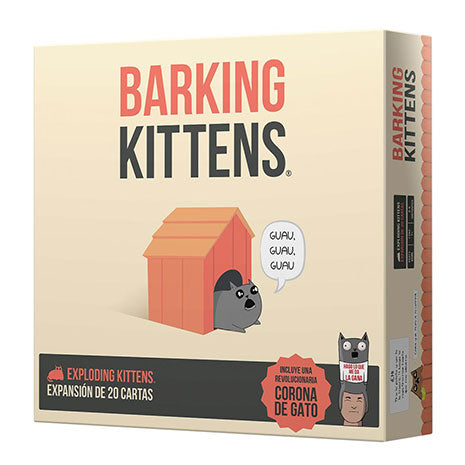Barking Kittens es una expansión para Exploding Kittens y Exploding Kittens NSFW, los juegos de gatos y explosiones. Incluye 20 nuevas cartas con acciones especiales nuevas llenas de locura y mala leche, así como el Gorro del Poder, una corona gatuna que irá pasando de jugador en jugador y que le dotará de increibles poderes (o no). Barking Kittens aporta mayor variedad de cartas tu Exploding Kittens sin complicar el reglamento ni cambiar la dinámica básica del juego. Quiero saber más.