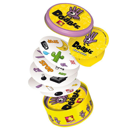 Dobble es un juego de cartas y agudeza visual para 2 a 8 jugadores. El objetivo del juego es conseguir el mayor numero de cartas posibles antes de que uno de los jugadores se quede sin cartas. Cada jugador tiene un mazo de cartas circulares en las que hay representadas varias imágenes. Cada ronda, los jugadores sacan cartas y las enseñan, tratando de ver que imágenes aparecen repetidas en las diferentes cartas. Puede parecer sencillo, pero no lo es! La orientación, el tamaño y la ubicación cambian en todas ellas dificultando la tarea. Cuando se identifica un motivo que aparece en dos cartas, el jugador que lo haya hecho se lleva las dos cartas a su zona de juego. Al final de la partida, quien más cartas acumule gana la partida. Quiero saber más.